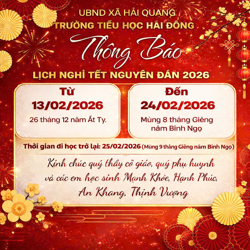 TRƯỜNG TIỂU HỌC HẢI ĐÔNG THÔNG BÁO LỊCH NGHỈ TẾT NGUYÊN ĐÁN BÍNH NGỌ NĂM 2026 NHƯ SAU: